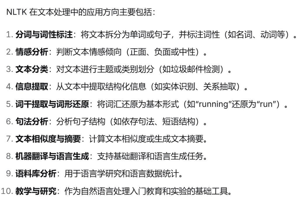 我向老师咨询“NLTK在文本处理领域有哪些应用方向”,在老师回答后,我选择了运用NLTK来处理文本的情感倾向。